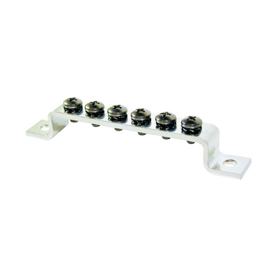 1/2″ wide; 3.75″ long; .57″ high. Drilled for #8 mounting screws. Six #8 screw terminals.
