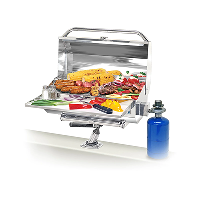 Meticulous attention to even the smallest details creates the finest value grill available. Wind tested for perfect even heat distribution, this grill offers the cooking performance usually only found in large back yard grills costing much more. Easily transported, the Fold-Away legs are out of the way on-board, but readily available for that quick picnic on shore. The swiveling control valve/regulator, designed to use 1lb. disposable propane fuel canisters, allows for quick, safe fuel canister exchanges or easily adapt grill to existing on-board low pressure propane (LPG) or natural gas (CNG) fuel systems.