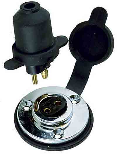 Rated for 15A at 12, 24 or 32 volts. Polarized double contact connector. Features flange gasket with integral waterproof cap for base when plug is removed.